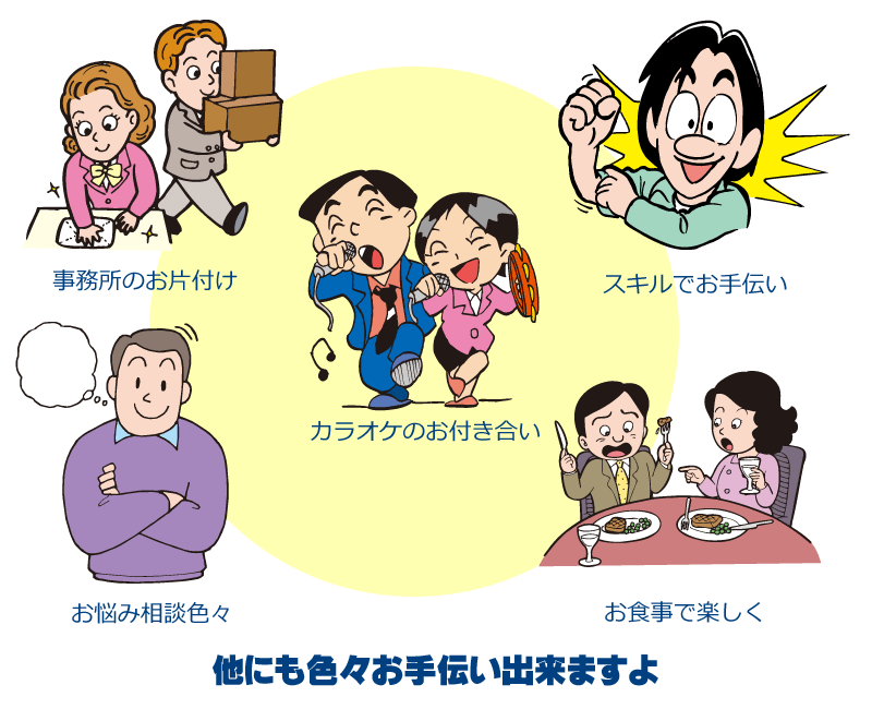 これは利用されたから聞いたことですが、相談以外でも「チケット取り」「買い物」「荷物持ち」「単なるランチ」「カラオケ同行」「家具の位置決め」「お酒の付き合い」「簡単な介護 出来る人限定」ほか色々です。 -